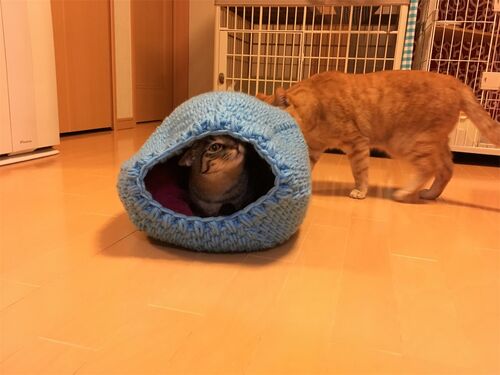 ポっくんのお友達しんちゃんとkoroさんから 手編みドームをいただきました〜! \1番乗りマコ/ \大きくなったと思ったら志のに変わってた/ みんな興味津々です。 そういえば、ポっくんはまだ入ってない。 マカロンベッドが大好きやから きっと手編みドー…